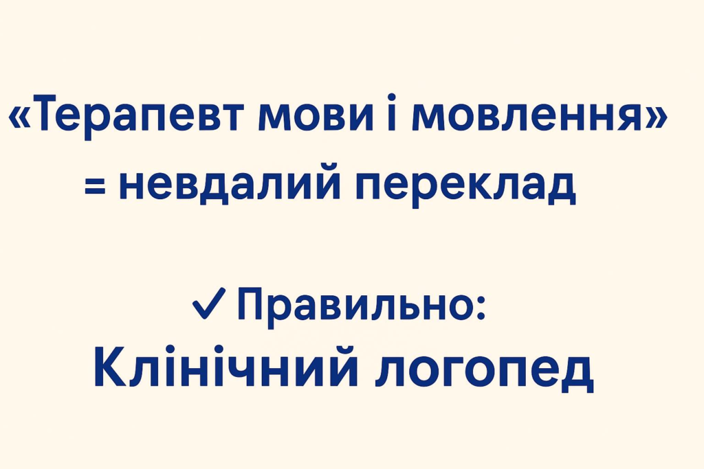 • Терапевт мови і мовлення — це некоректний переклад англійської назви Speech-Language Therapist (SLT). В оригіналі йдеться про терапевта з мови та мовлення, який фактично виконує функції клінічного логопеда. В українській мові ця калька звучить неприродно й не відображає клінічного контексту.